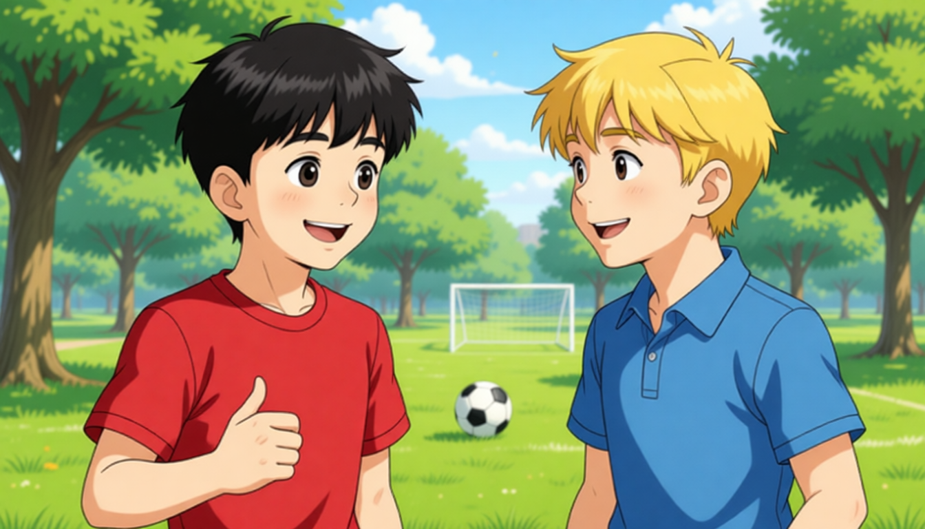 Zhang Peng asks Peter, "Can you teach me an English song? I can teach you a fun football trick." Peter thinks it is a good idea. Then Zhang Peng learns to sing a new song. Peter learns to play football better. They teach each other, and their friendship becomes stronger.