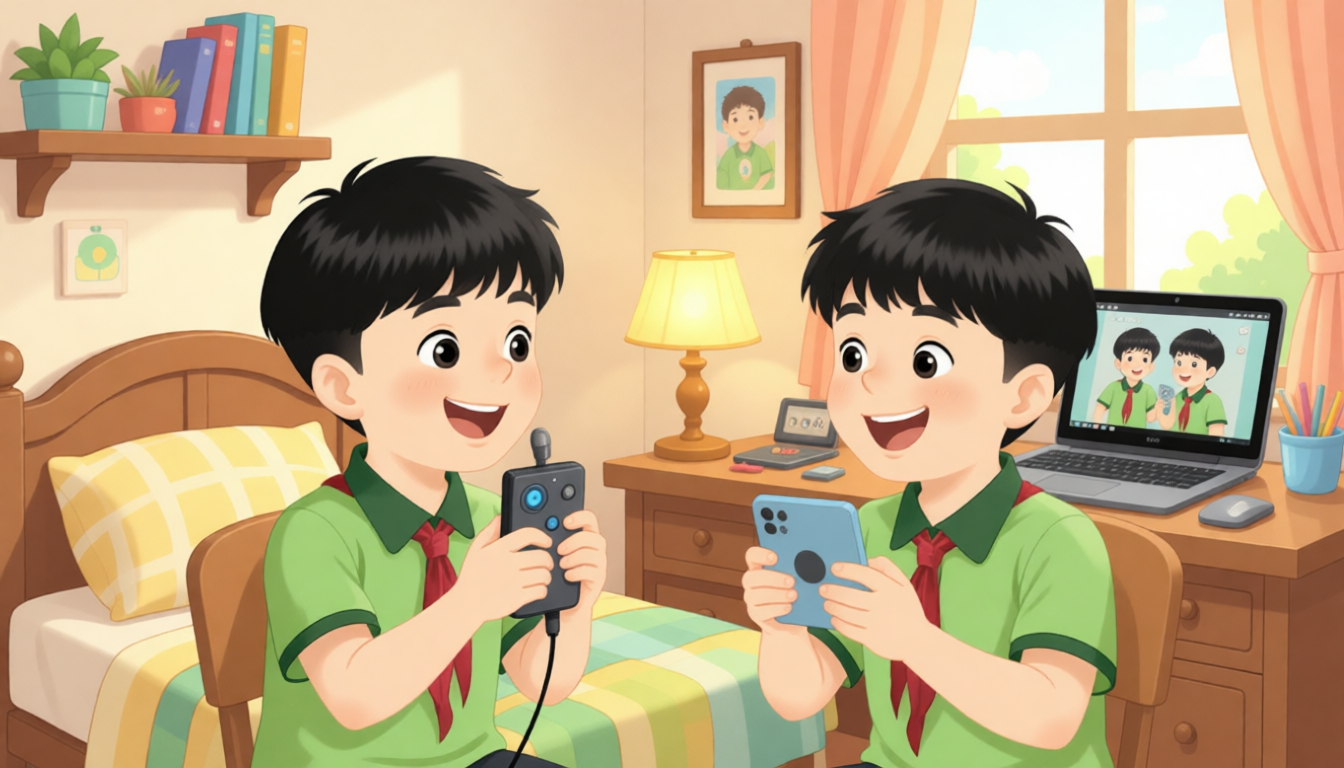 Zhang Peng and Peter decide to sing the same song. Zhang Peng records his singing voice. Peter also records his singing voice. They send videos to each other. They feel like they are singing together.