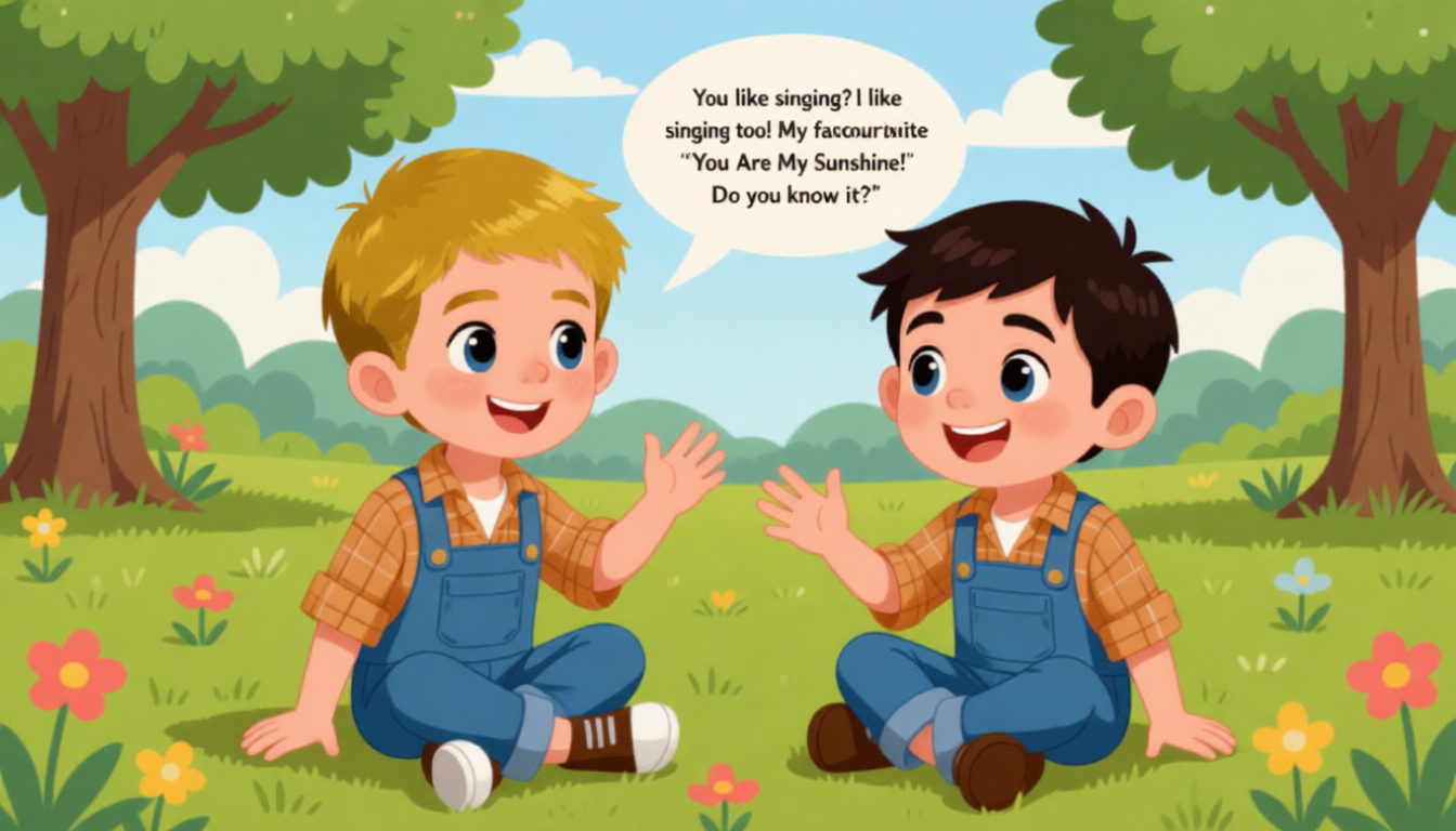 Peter replies, "You like singing? I like singing too! My favourite song is 'You Are My Sunshine'. Do you know it?" Zhang Peng knows this song. He feels very happy.