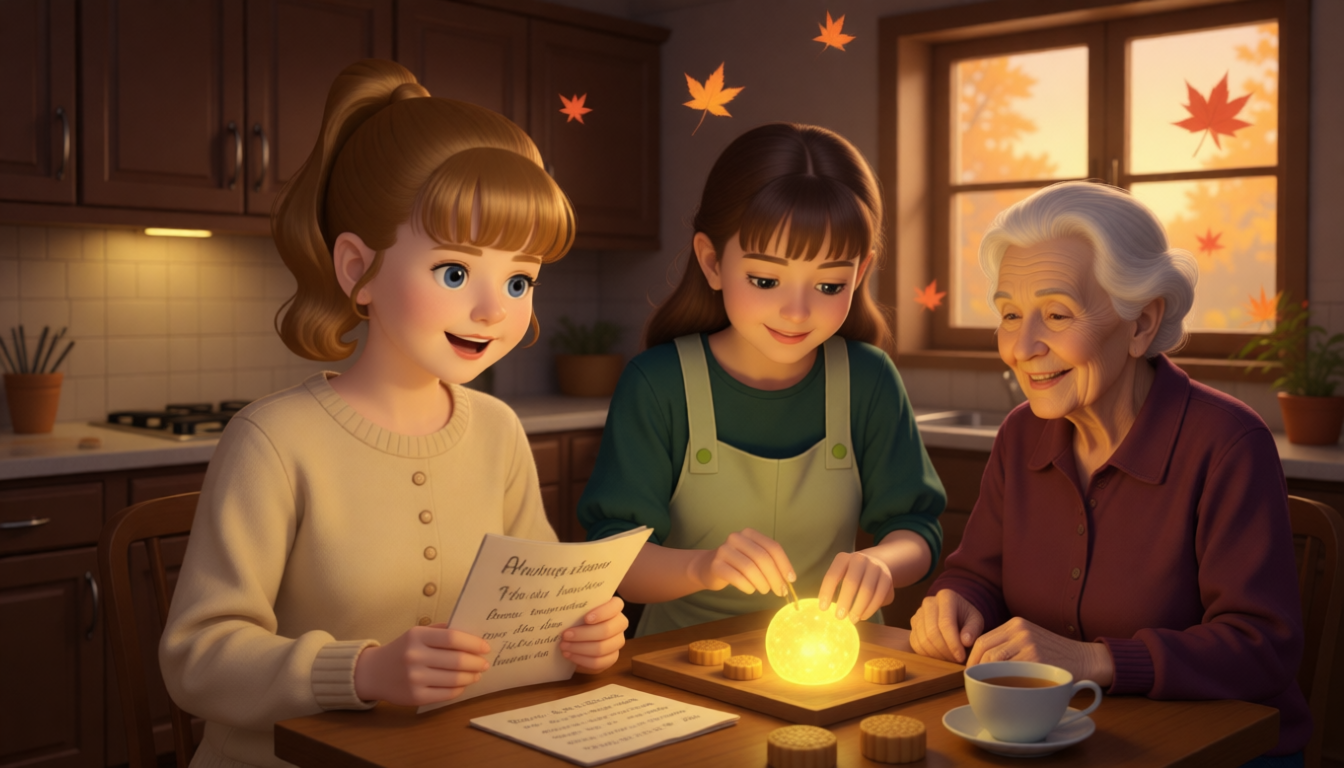 Sarah says, ''Look, my aunt is going to make mooncakes. My grandma will tell us a story about Chang’e. I’m going to read a poem about FAMILY. F stands for family. A stands for autumn. M stands for moon. I stands for I. L stands for love. Y stands for you.''