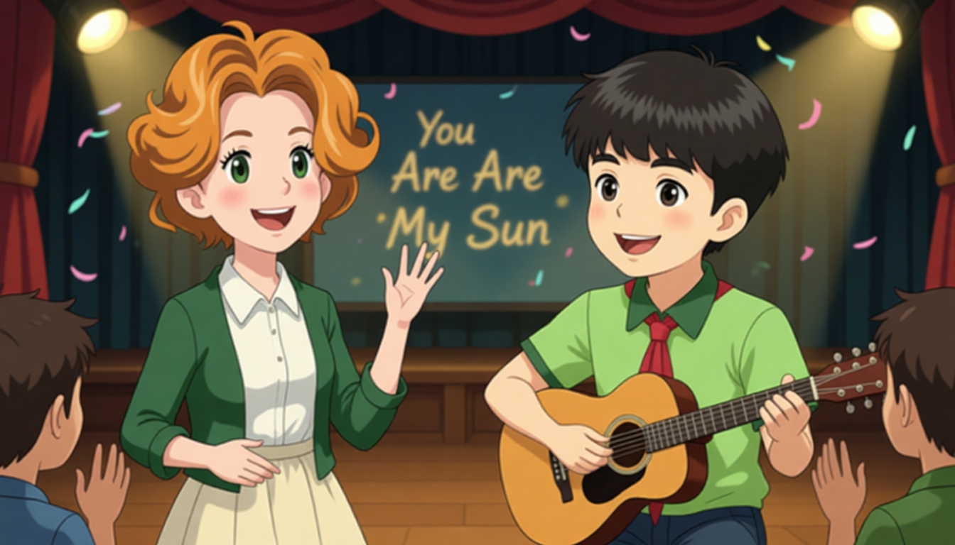 Zhang Peng's school has a music party. Zhang Peng asks his teacher Peter if he can join online. Peter says yes. At the party, Zhang Peng plays the guitar and sings "You Are My Sun". Peter plays the song on the big screen. Everyone claps for them.