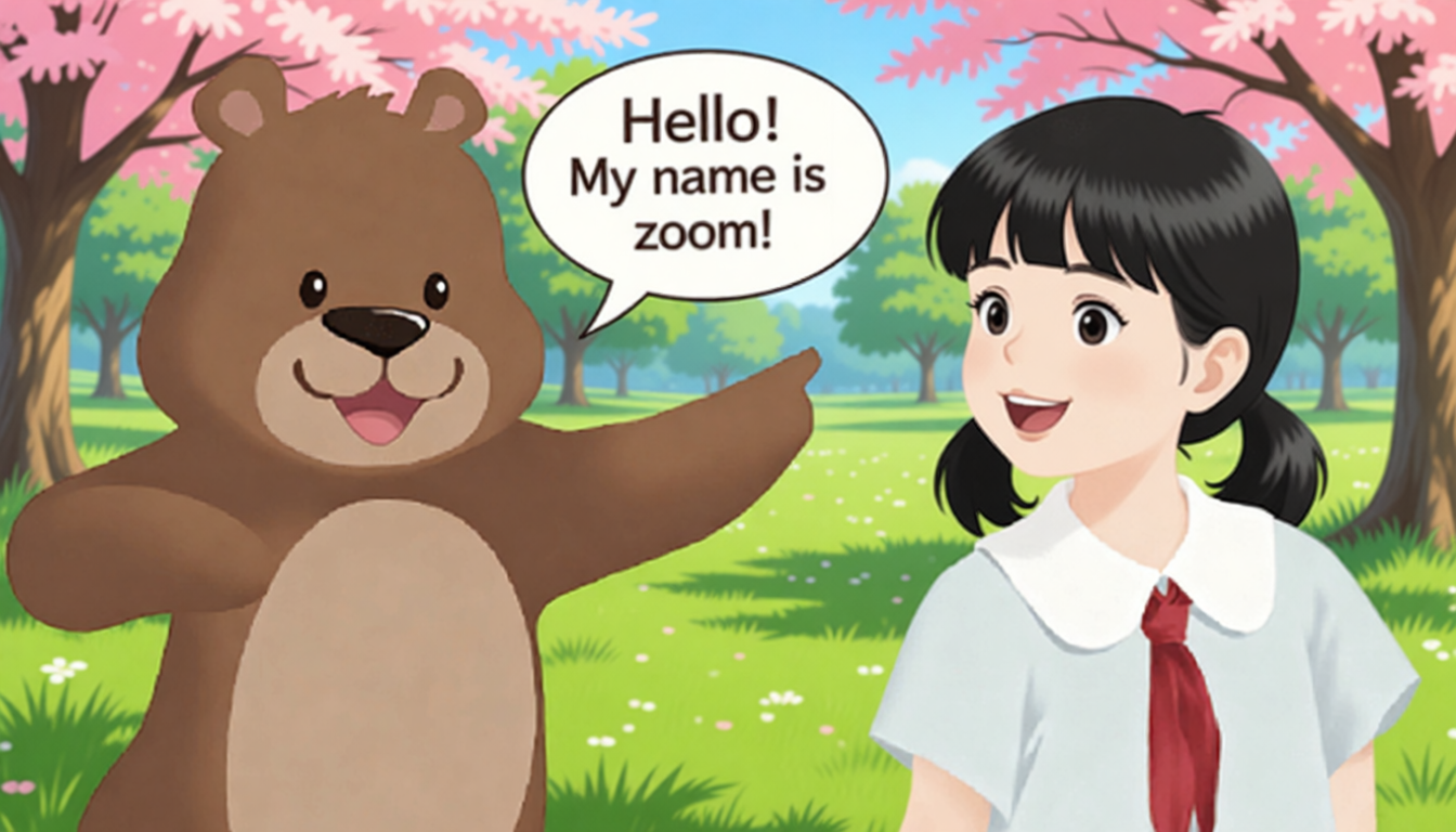 Zoom says, "Hello! My name is Zoom!" Chen Jie says, "Hi, my name is Chen Jie. Nice to meet you." Zoom says, "Nice to meet you too." Chen Jie says, "I like apples." Zoom says, "Do you like apples?" Chen Jie says, "No! I like bananas."