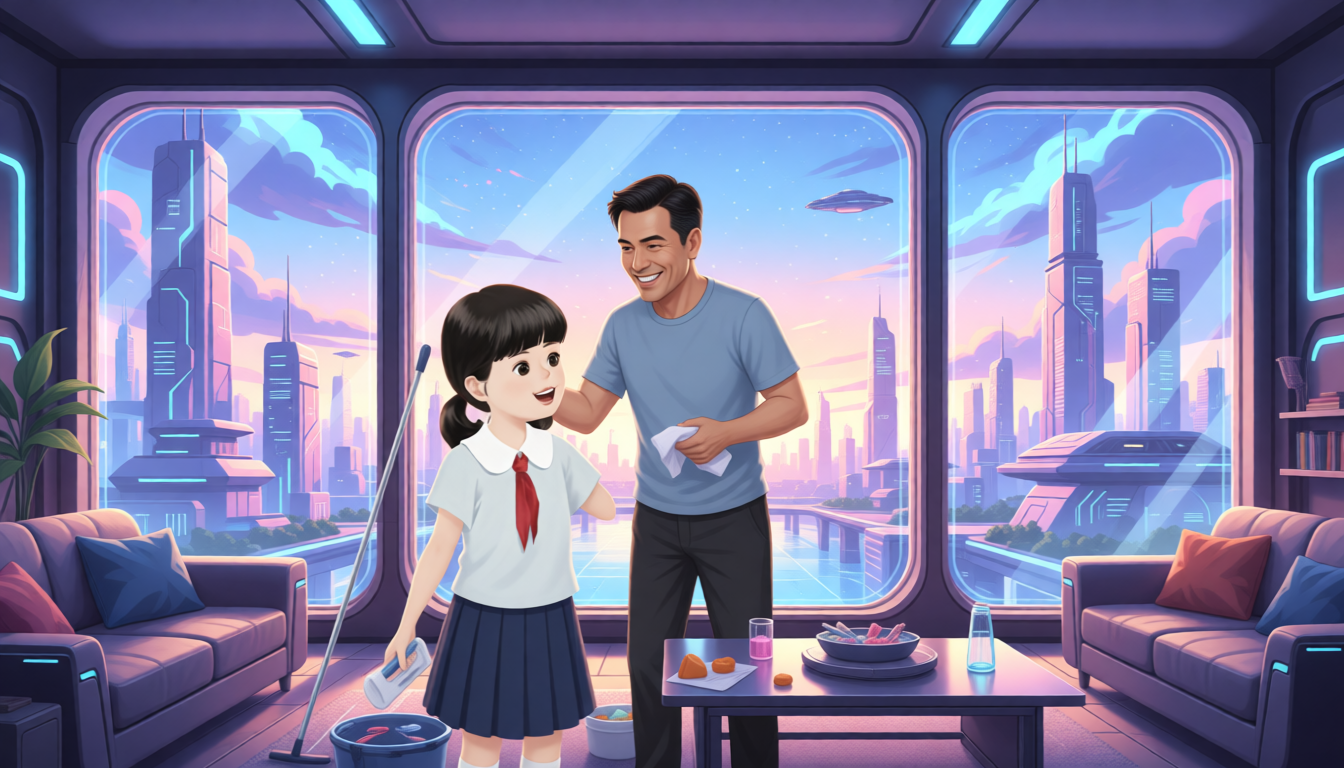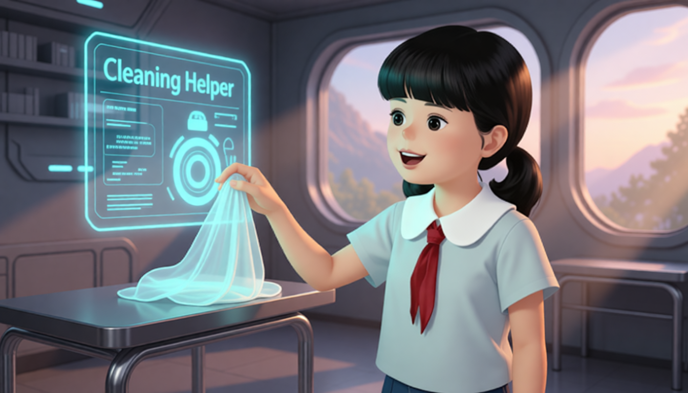 Chen Jie finishes quickly and helps mum dust the shelf. She uses a soft cloth to wipe the shelf. She sings when she cleans.
