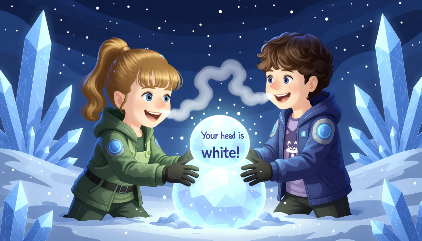 Suddenly, it is snowy! Big white snowflakes fall down. We can make a snowman. Sarah pushes the snowballs. We make a big snowman. Sarah says I can play in the snow. Mike says they are very excited. Sarah and Mike say at the same time, "Your head is white!" They both laugh.