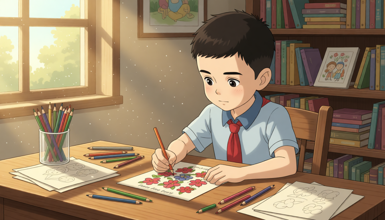 Wu Binbin gets some paper and colored pencils. He wants to make beautiful cards for his parents. He sits at the desk. He starts to draw heart-shaped flowers.