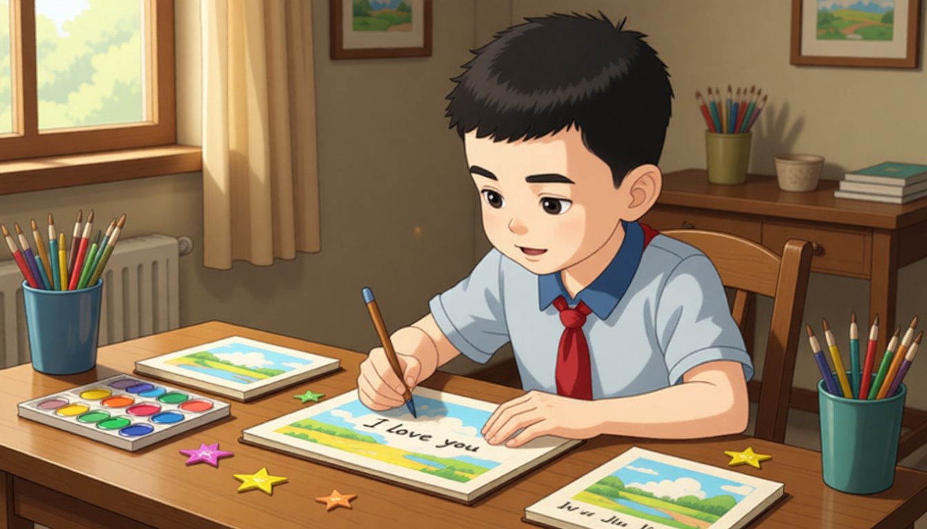 Wu Binbin works very hard on the cards. He draws beautiful pictures on them. He writes "I love you" with his neatest handwriting. He even sticks shiny stickers to make the cards more special.