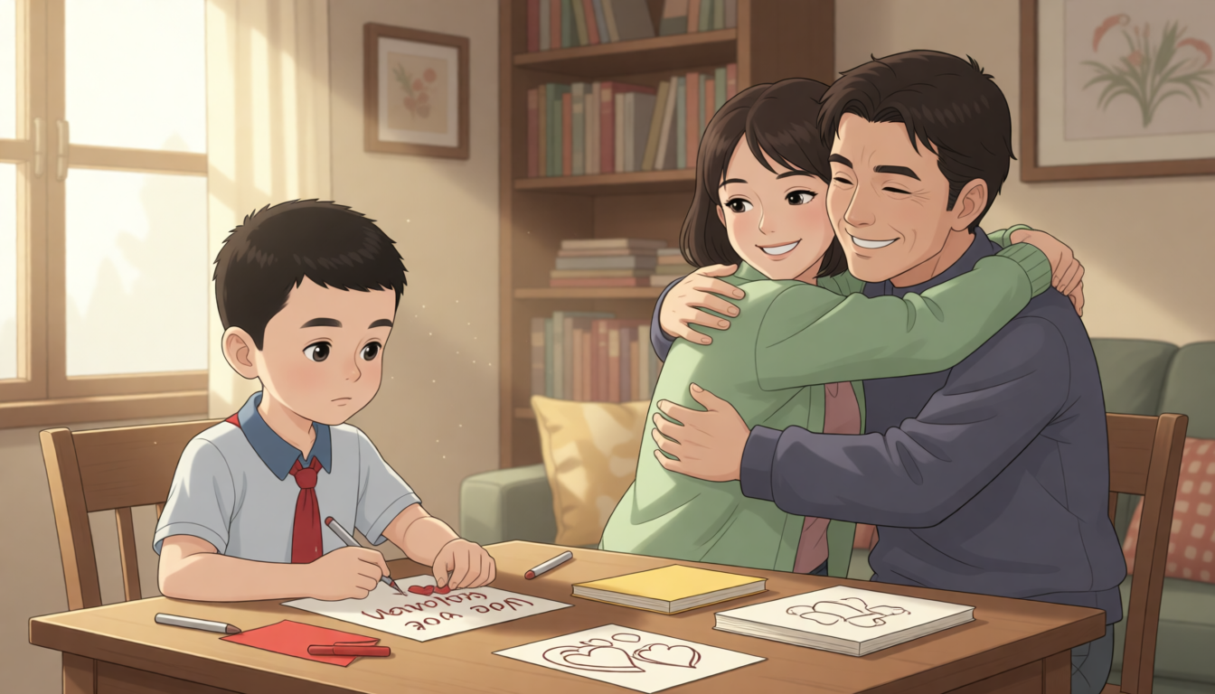 After receiving Wu Binbin's lovely cards, mum and dad have a surprise too. They make special cards for Wu Binbin. The cards have hearts on them. They write "We love you too" on the cards. The whole family shares hugs and smiles.