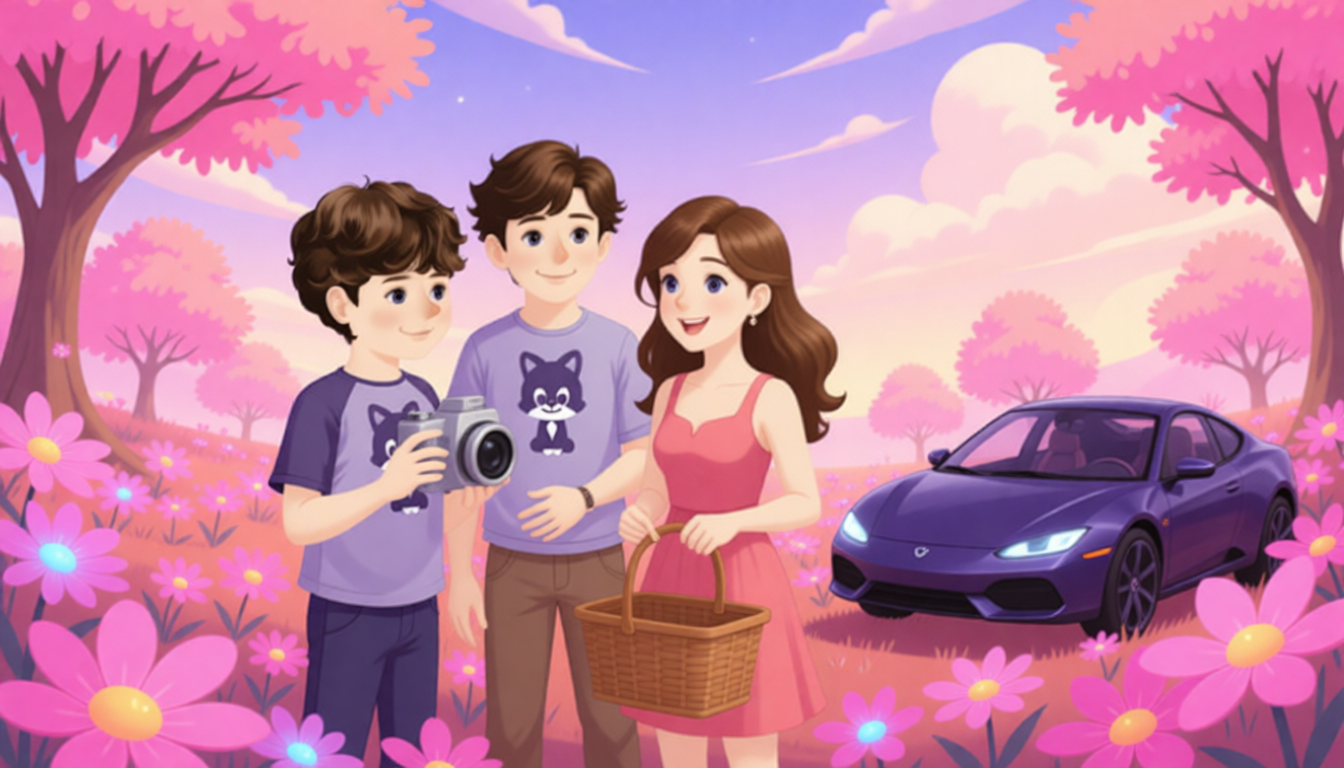 On the way to the picnic, they find a place full of lovely pink flowers. Mike's family is very happy. They decide to take some photos there.