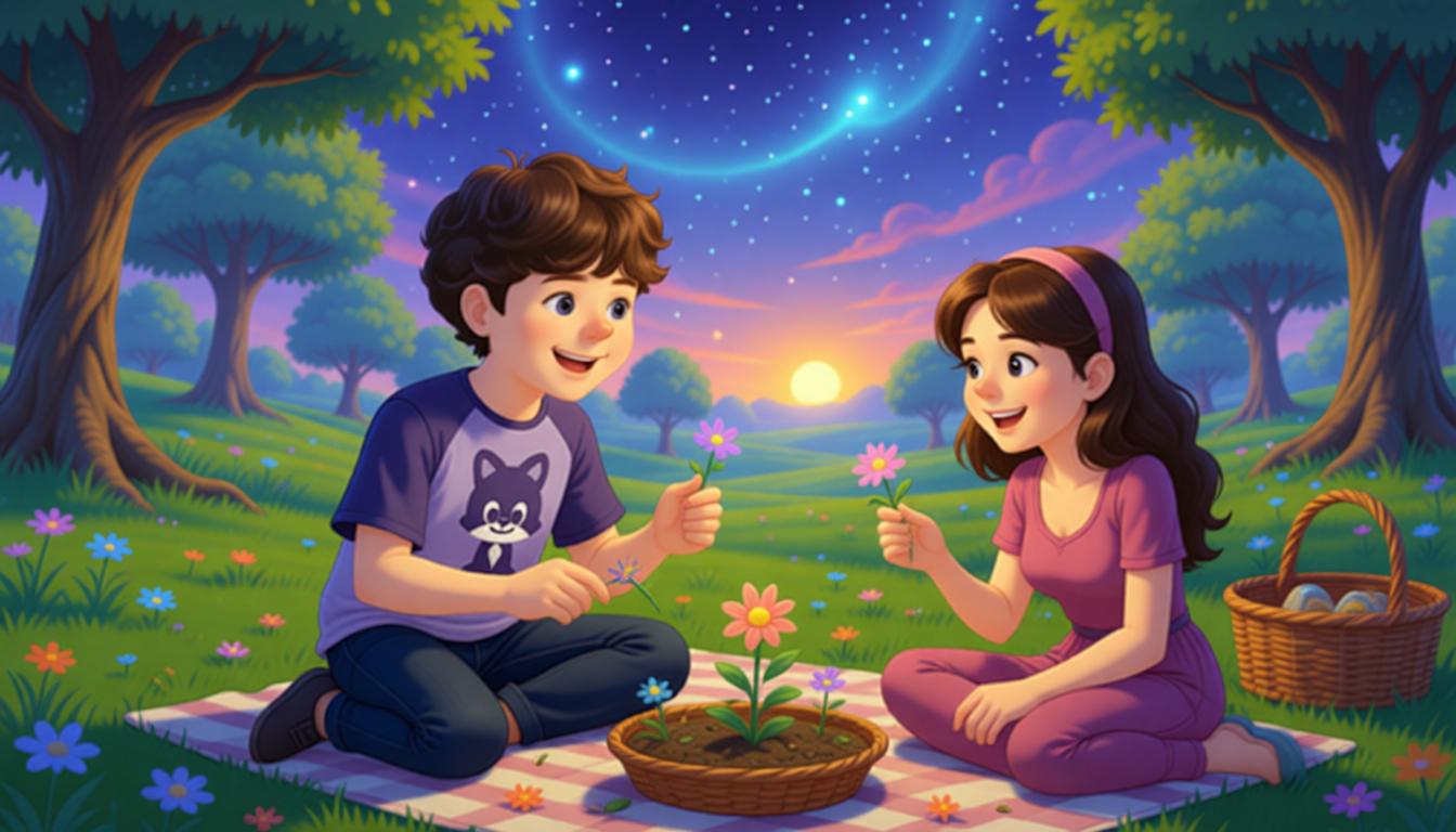 They have a wonderful picnic in the beautiful place. They collect some flower seeds. They plan to plant them at home. This will be a nice memory.
